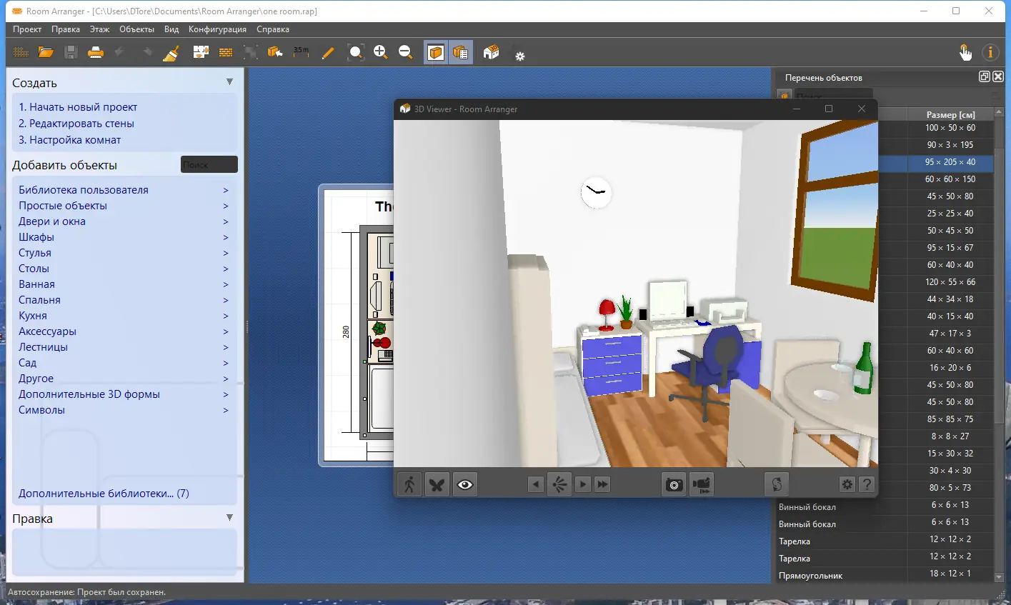 - Обеспечивает просмотр проекта в 3D-режиме с возможностью перемещения по сцене