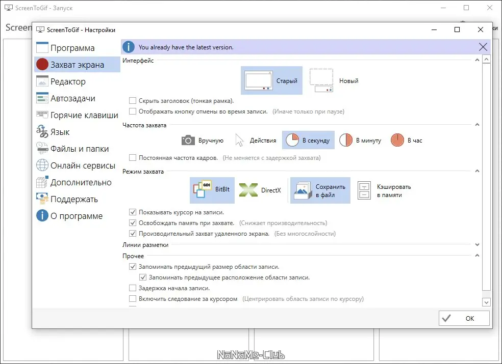 - Настройка частоты кадров от 1 до 60 FPS для баланса между плавностью и размером файла.