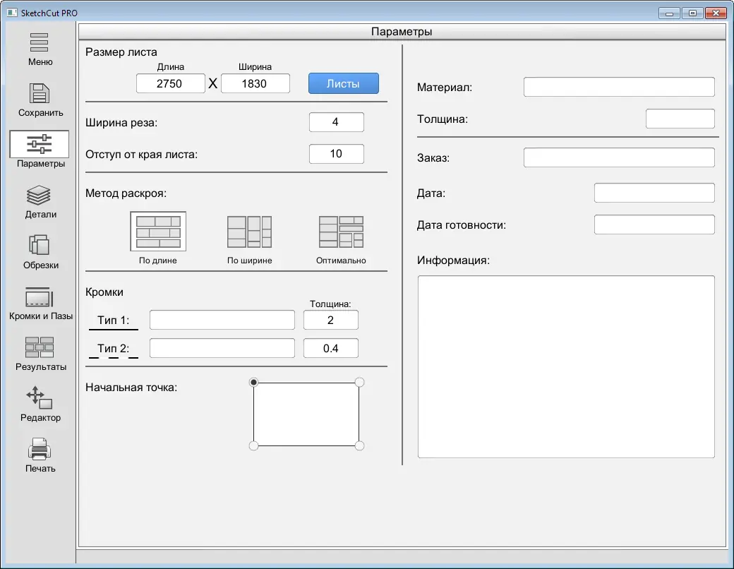 SketchCut позволяет эффективно организовать процесс раскроя за счёт продуманной логики работы и широких настроек. Пользователь может задать размеры исходных листов, указать отступы от краёв, ширину реза и направление резки — всё это напрямую влияет на точность и экономичность раскроя. Ввод данных о деталях осуществляется в табличном виде, похожем на редактор Excel, что упрощает импорт и корректировку габаритов.