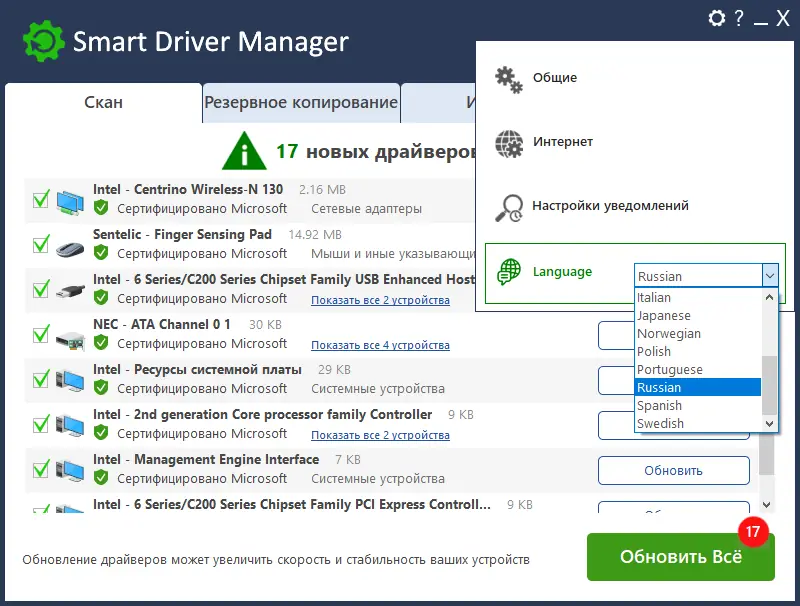- Автоматически сканирует все подключённые устройства и анализирует состояние драйверов.