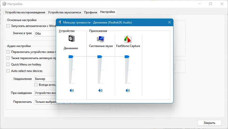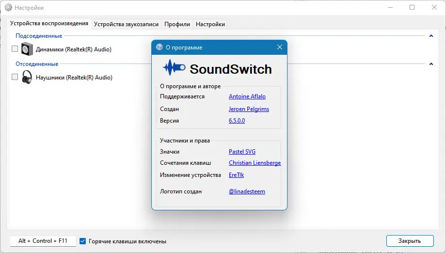- Поддержка горячих клавиш для переключения устройств воспроизведения и записи