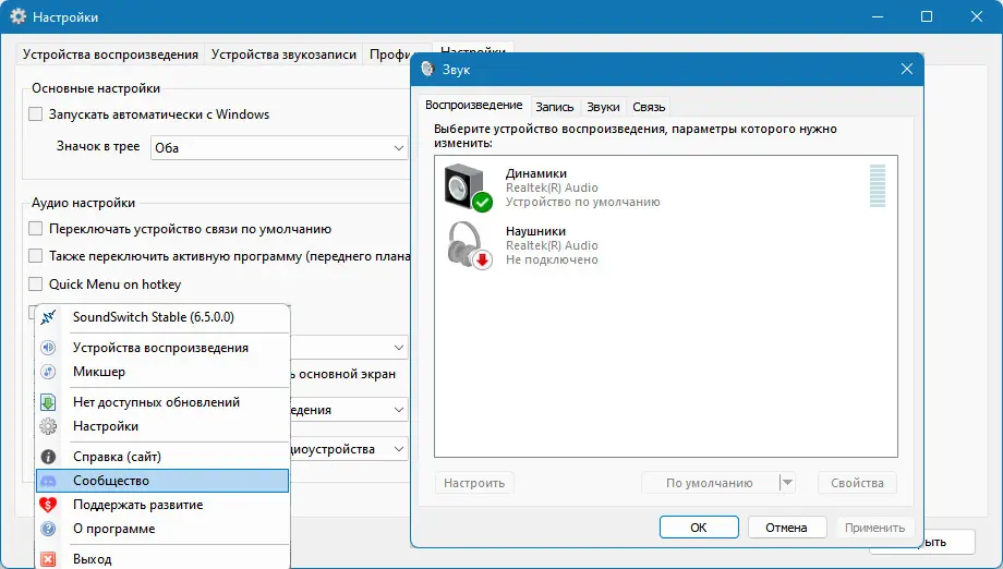 SoundSwitch — это компактная утилита для быстрого переключения между аудиоустройствами на компьютере. Программа упрощает выбор активных устройств воспроизведения и записи с помощью горячих клавиш, избавляя от необходимости заходить в системные настройки звука. Работает стабильно на различных версиях Windows и поддерживает множество языков, включая русский.