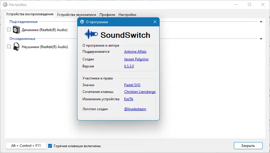 - Быстрое переключение между аудиоустройствами по горячим клавишам