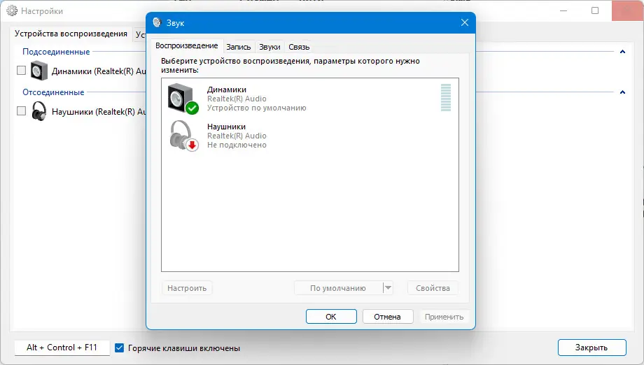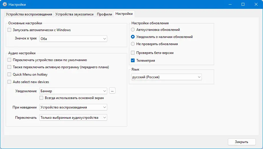 SoundSwitch — это бесплатная утилита для Windows, которая упрощает переключение между аудиоустройствами воспроизведения и записи с помощью настраиваемых горячих клавиш. Программа избавляет от необходимости открывать системные настройки звука и вручную выбирать нужное устройство, что особенно удобно при использовании нескольких колонок, наушников, микрофонов или студийного оборудования.