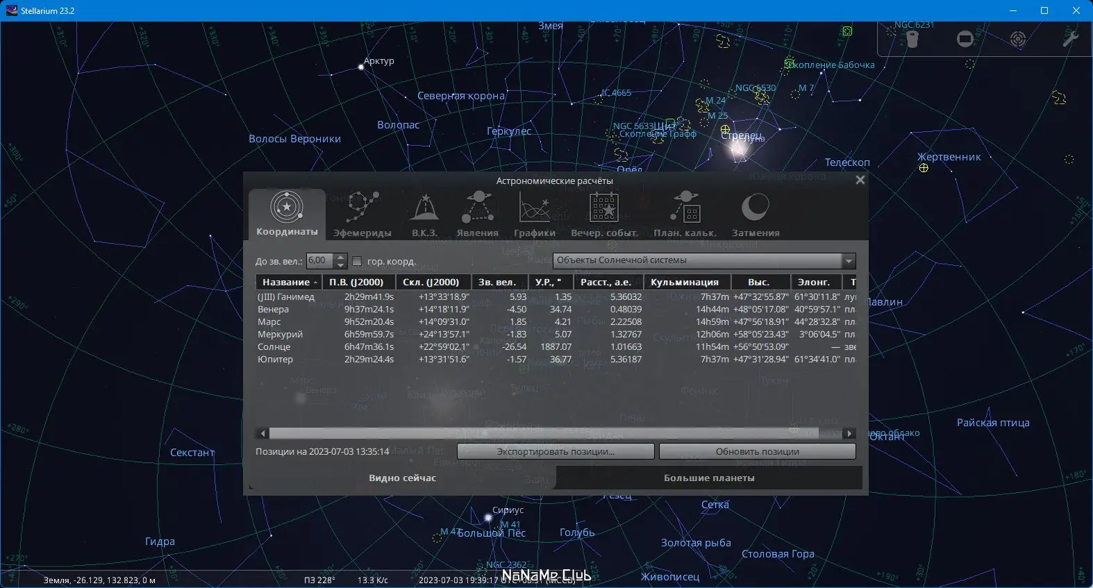 - Позволяет наблюдать планеты Солнечной системы вместе с их спутниками в реальном времени.