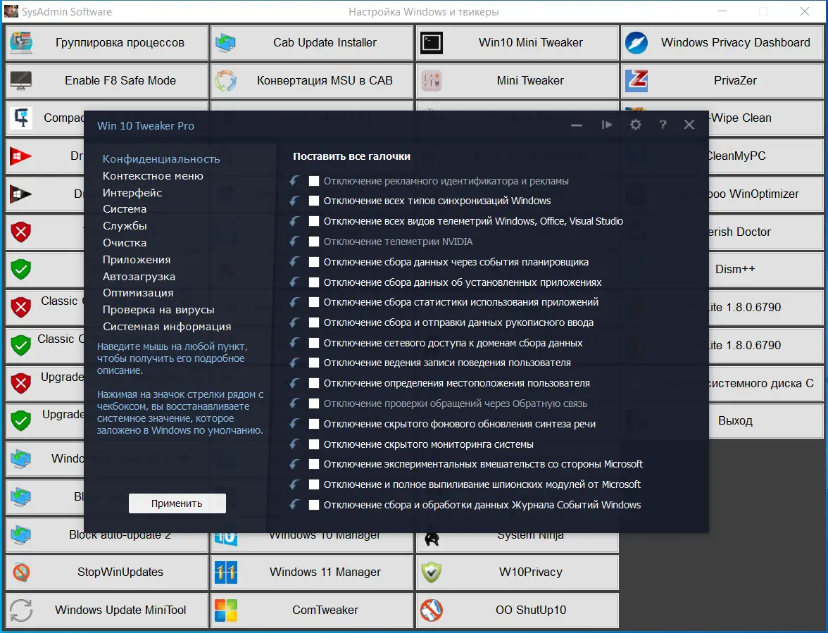 - Огромная коллекция утилит, включая инструменты от известных разработчиков.