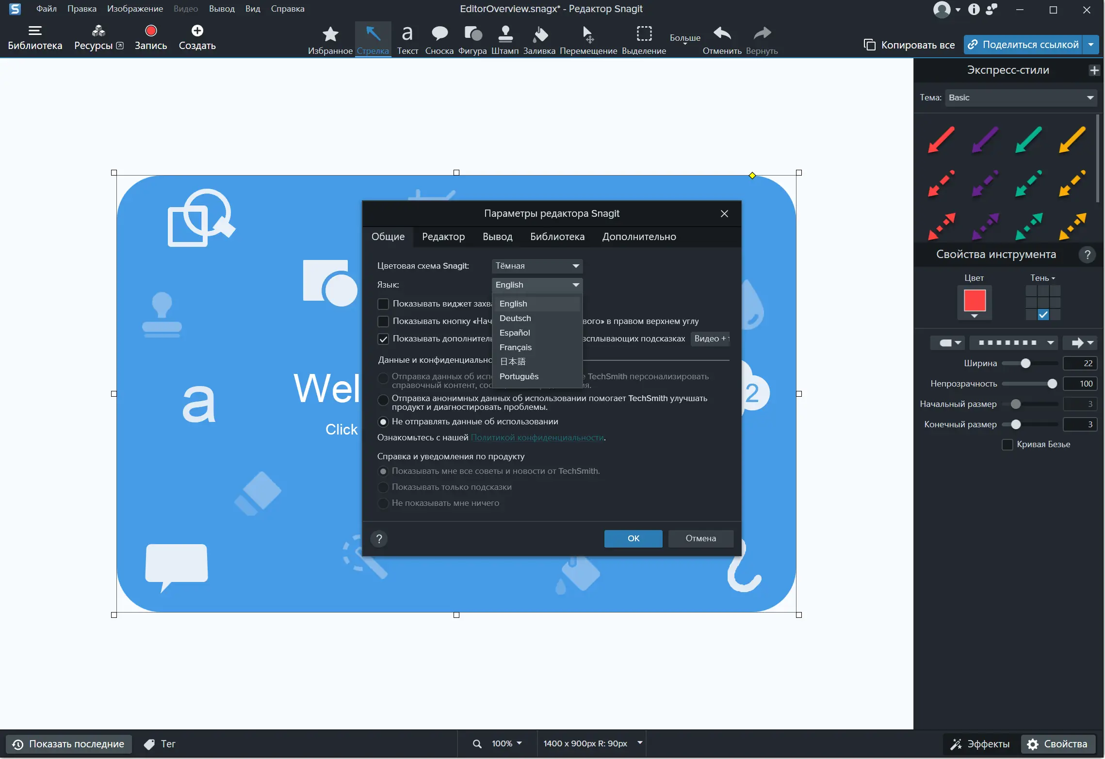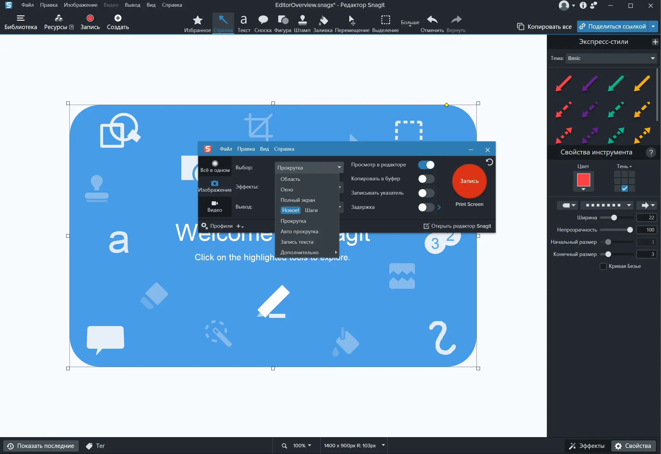 TechSmith Snagit — это мощное программное решение для захвата экрана, записи видео и редактирования изображений с широким набором инструментов. Программа поддерживает захват произвольных областей, окон, прокручиваемых элементов, а также полноценную запись экрана в формате AVI. Встроенные редакторы позволяют быстро добавлять аннотации, стрелки, текст и другие пояснения, что делает Snagit идеальным выбором для создания инструкций, презентаций и технической документации.