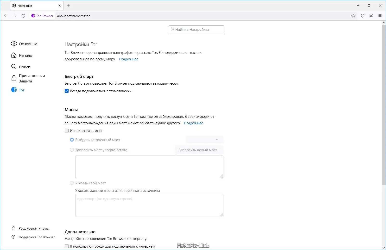 - Возможность подключения через мосты при блокировке основных узлов