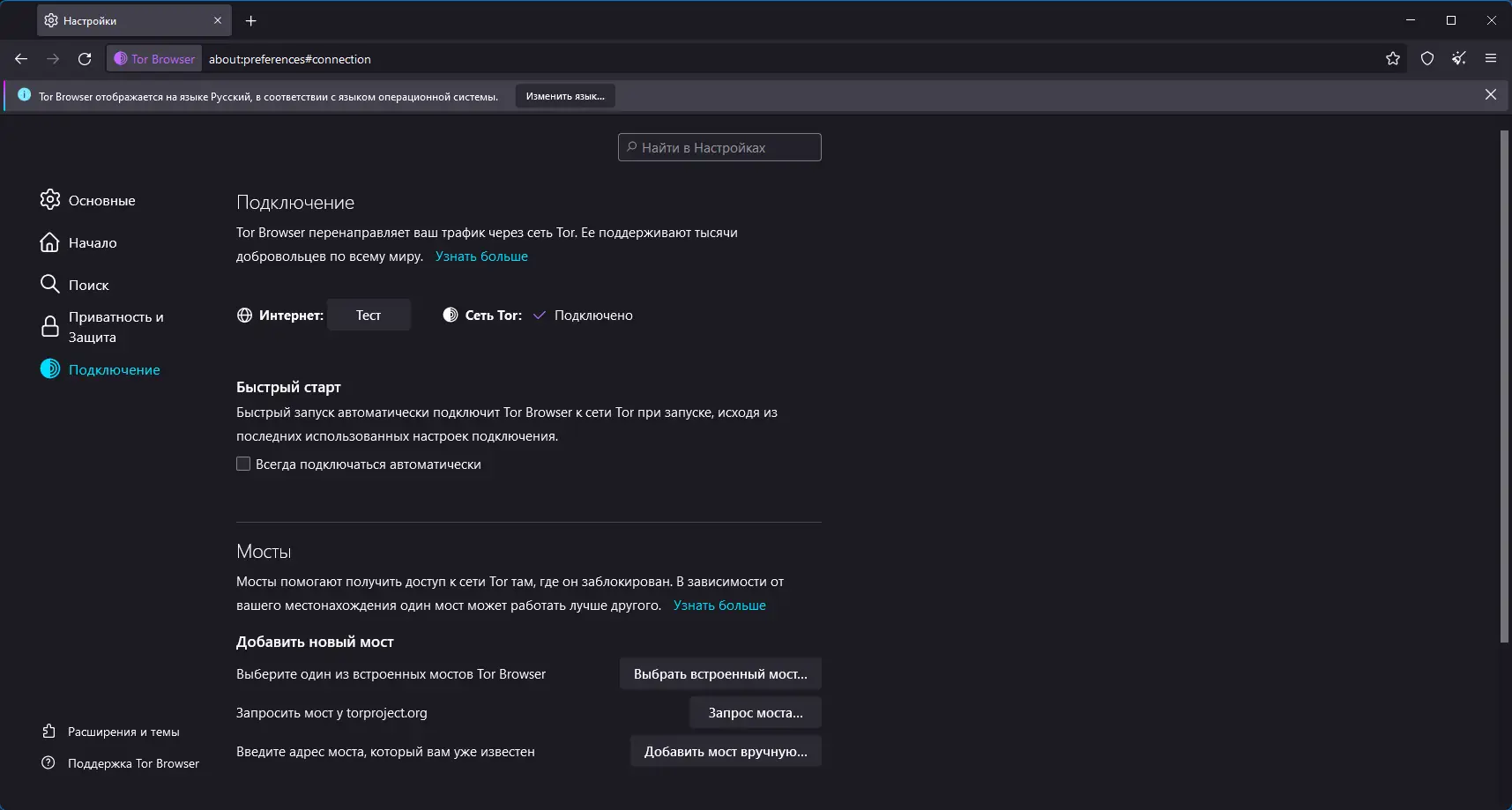 - Поддерживает работу с мостами, что помогает обойти блокировки в странах с цензурой интернета.