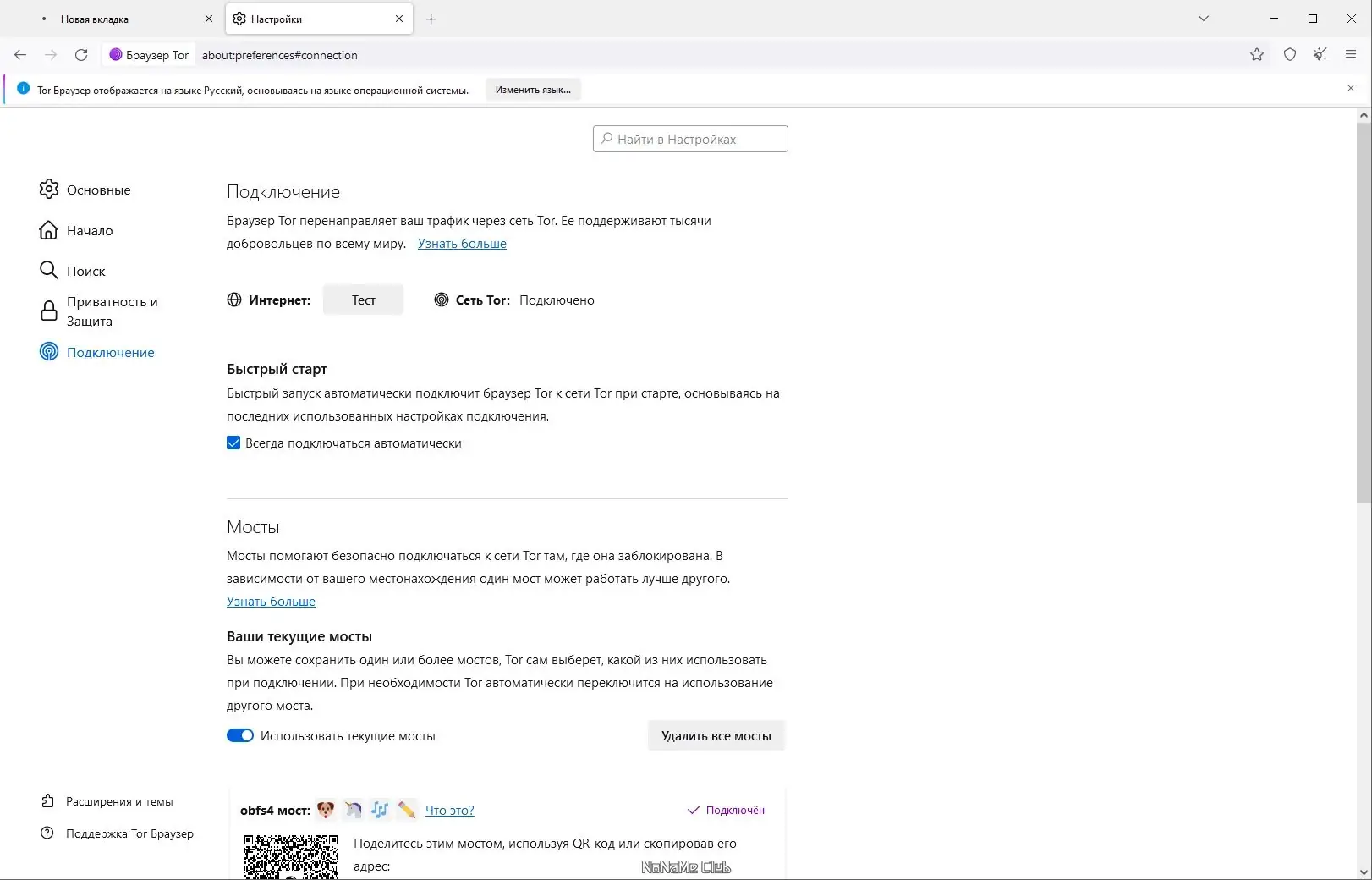 - Поддерживается работа с мостами — специальными узлами, которые помогают обойти блокировки в странах, где доступ к сети Tor ограничен.