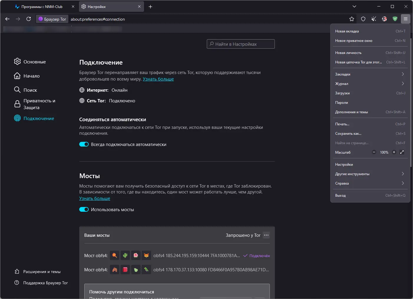 - Поддерживает работу с мостами, что помогает обходить блокировки в строгих сетях.