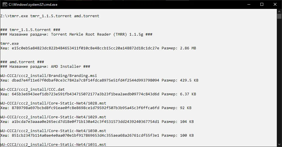 Для извлечения данных из .torrent-файла достаточно запустить утилиту с указанием пути к файлу. Команда tmrr.exe имя_файла.torrent выведет название раздачи, список файлов с их размерами и соответствующие корневые хеши. Чтобы вычислить хеш конкретного файла, используется флаг r: tmrr.exe r ваш_файл. Результат можно перенаправить в текстовый файл с помощью оператора >, например: tmrr.exe команда > output.txt. Это удобно при массовой обработке или архивировании информации.