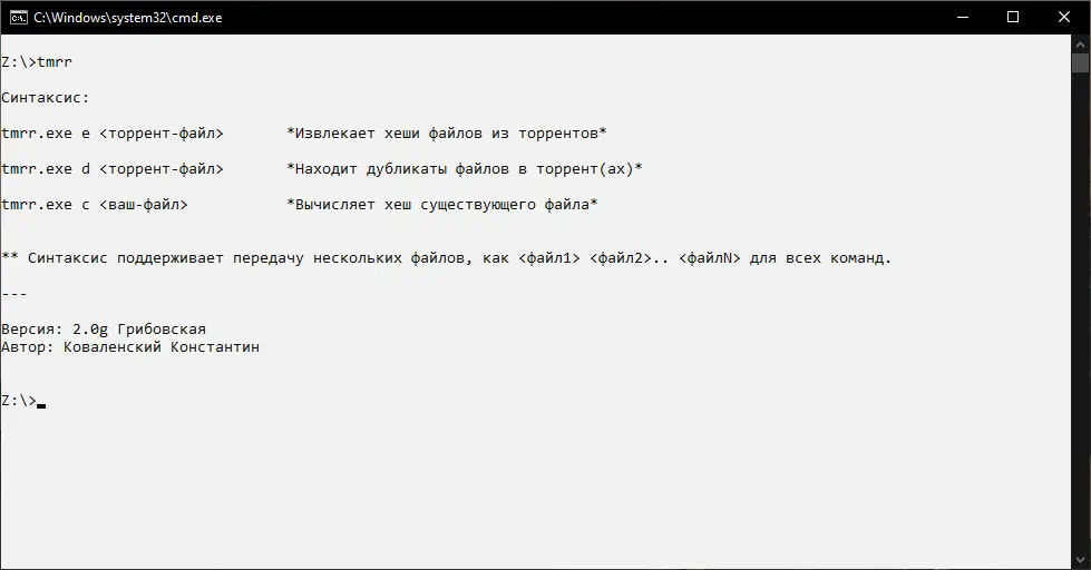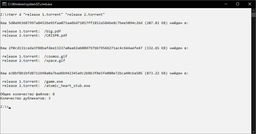 Использование утилиты предполагает работу через командную строку. Для извлечения хешей из .torrent-файла применяется команда tmrr.exe e файл.torrent, которая выводит список хешей, соответствующих файлам в раздаче. Чтобы найти дубликаты между несколькими раздачами, используется режим tmrr.exe d с перечислением всех интересующих торрентов. Генерация хеша для произвольного файла выполняется командой tmrr.exe c ваш_файл, что полезно при сопоставлении локальных данных с торрент-сетями. Результаты можно перенаправить в файл с помощью оператора > output.txt. Для удобства доступна смена языка интерфейса через команду tmrr.exe locale ru или en. Утилита отображает имена раздач, размеры файлов, количество элементов и найденные дубликаты, обеспечивая полную картину анализа.