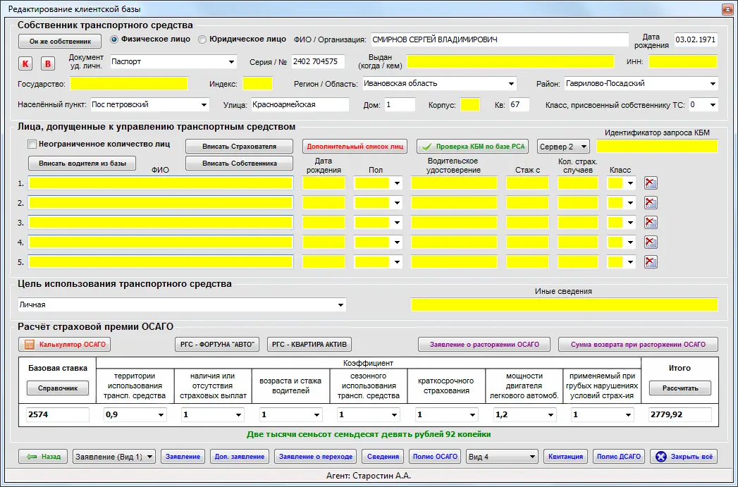 Использование программы начинается с настройки базы данных и ввода первичной информации о клиентах и транспортных средствах. После регистрации клиента система сохраняет все сведения: паспортные данные, водительские удостоверения, историю страхования и КБМ. При оформлении нового полиса достаточно выбрать клиента из списка, и программа автоматически подставит актуальные данные. Калькулятор ОСАГО рассчитывает стоимость с учётом всех коэффициентов: возраста, стажа, региона и количества водителей. Перед печатью можно отрегулировать расположение полей на бланке, включая QR-код, который генерируется в соответствии с требованиями РСА. Отправка SMS-уведомлений и экспорт данных в Excel выполняются в один клик.