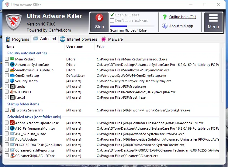 Использование утилиты не требует технических знаний. После запуска интерфейс отображает кнопку «Start scan», нажатие на которую запускает процесс сканирования всех учётных записей на наличие adware. Программа анализирует установленные расширения, службы, автозагрузку и параметры браузеров. По завершении проверки отображается список найденных элементов, каждый из которых можно отметить для удаления. Подтверждение действия приводит к немедленной очистке системы. При необходимости пользователь может дополнительно инициировать сброс настроек браузеров Chrome и Firefox, что особенно полезно при сильном заражении.