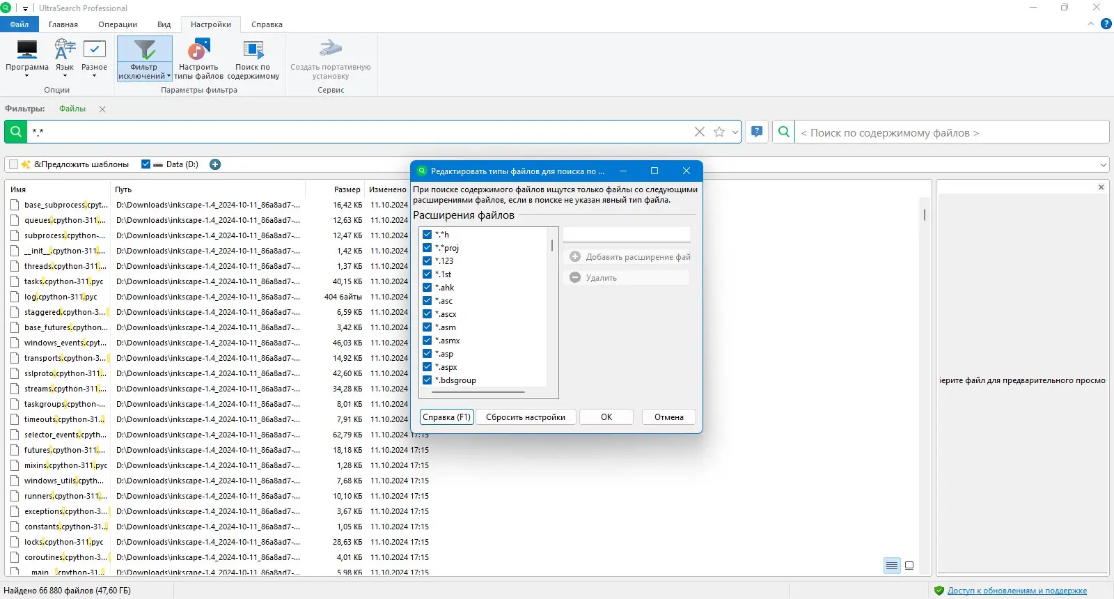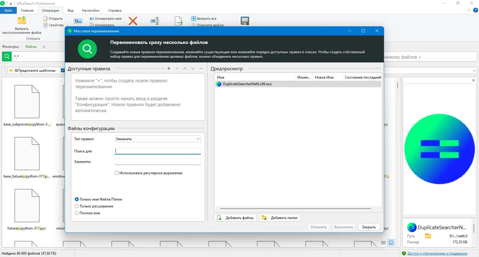 - Поддержка масок файлов, например, *.exe, и регулярных выражений