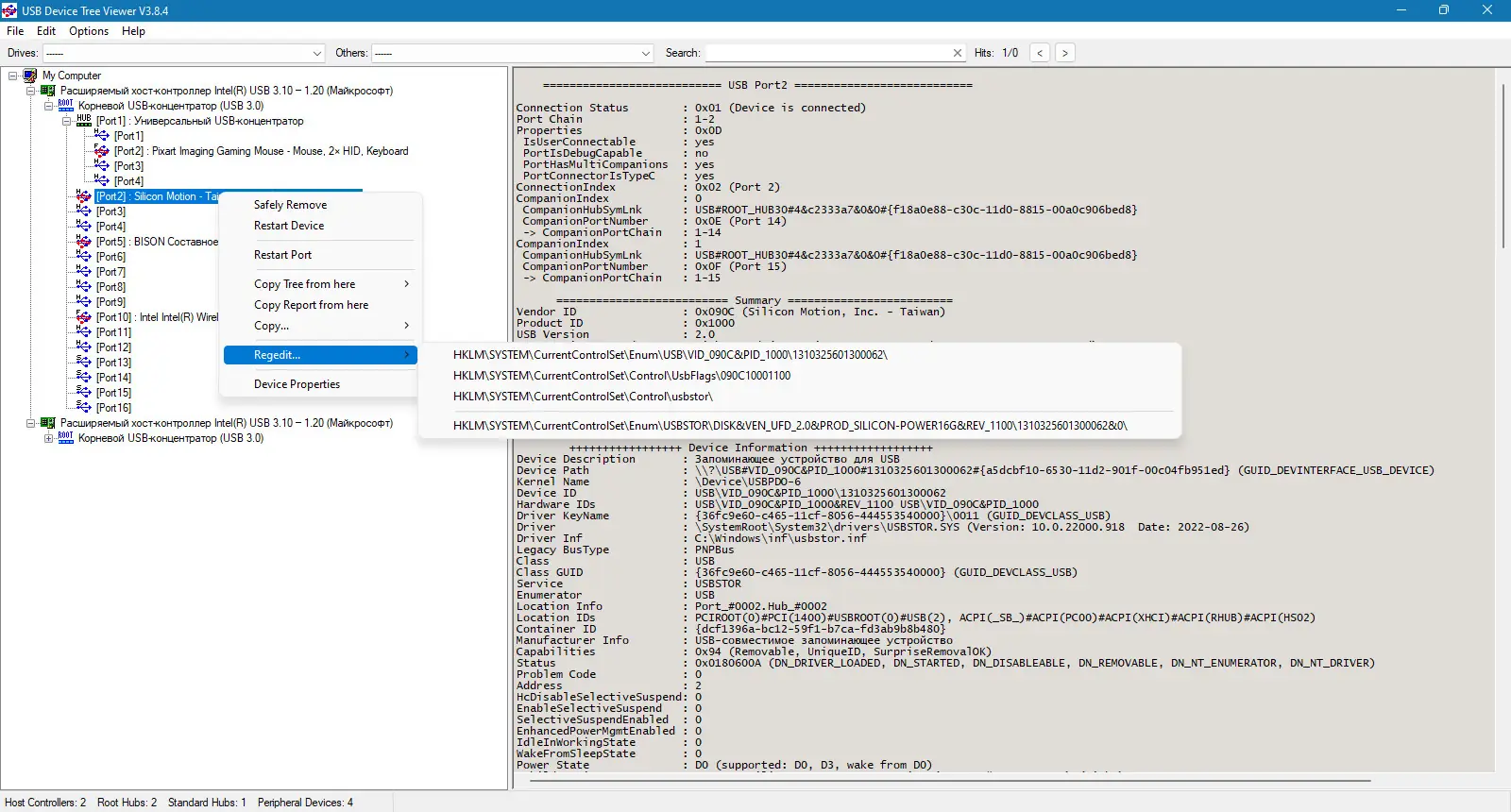 Использование USB Device Tree Viewer интуитивно понятно. После запуска приложение автоматически сканирует все USB-контроллеры и подключённые устройства, строя иерархическое дерево. Пользователь может раскрывать узлы, чтобы увидеть подробную информацию о каждом компоненте. В правой панели отображаются свойства выбранного устройства: идентификатор, класс, производитель, версия USB, текущая и максимальная скорость, буква диска (если применимо), номер COM-порта. Через контекстное меню доступны действия: безопасное извлечение, перезагрузка устройства или порта, переход к свойствам в диспетчере устройств, открытие ключа реестра. Также можно использовать поиск по идентификаторам, буквам дисков или именам устройств, а в сложных конфигурациях — панель переходов для быстрой навигации.