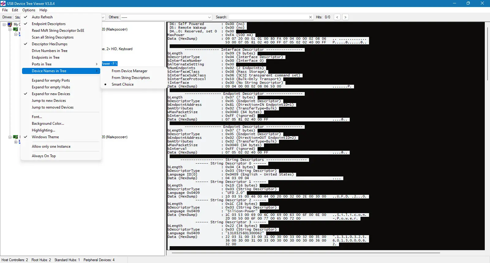 - Отображает USB-устройства в виде иерархического дерева с возможностью раскрытия вложенных узлов