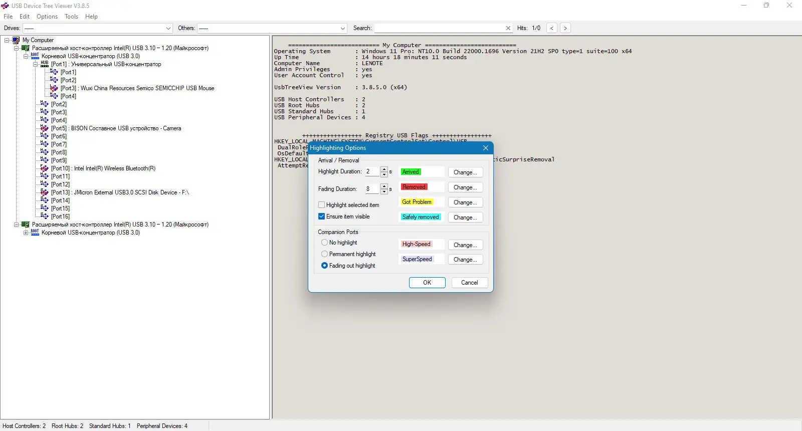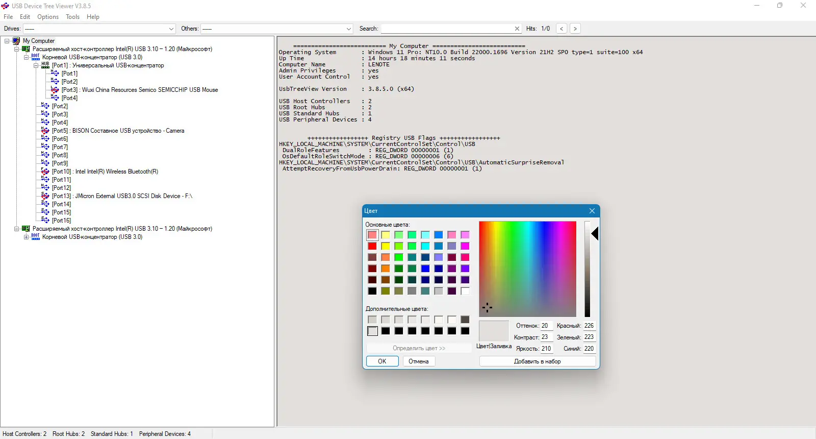 - Отображение полной иерархии USB-устройств в виде дерева с иконками и цветовой индикацией состояния