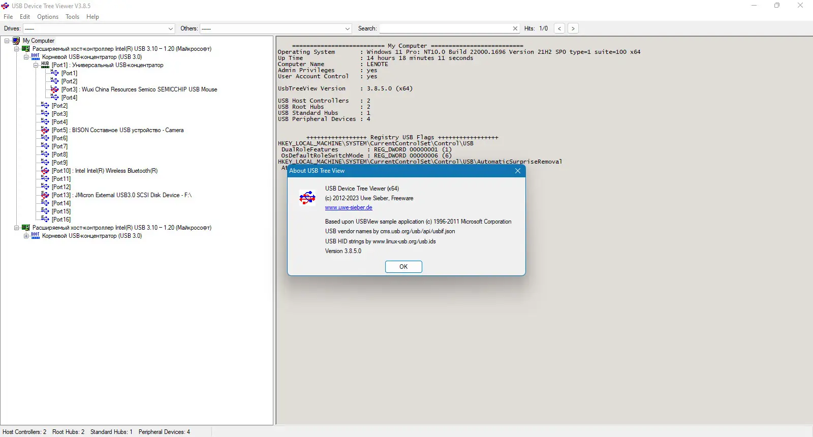 USB Device Tree Viewer построен на основе исходного кода Microsoft USBView и расширяет его функционал, обеспечивая более глубокую интеграцию с системой Windows. Утилита позволяет просматривать не только подключённые USB-устройства, но и их внутреннюю структуру, включая дочерние компоненты, такие как COM-порты и буквы дисков. Отличительной чертой является асинхронное обновление данных — при подключении или отключении устройства выделенный элемент в дереве не сбрасывается, что удобно при диагностике динамических изменений.