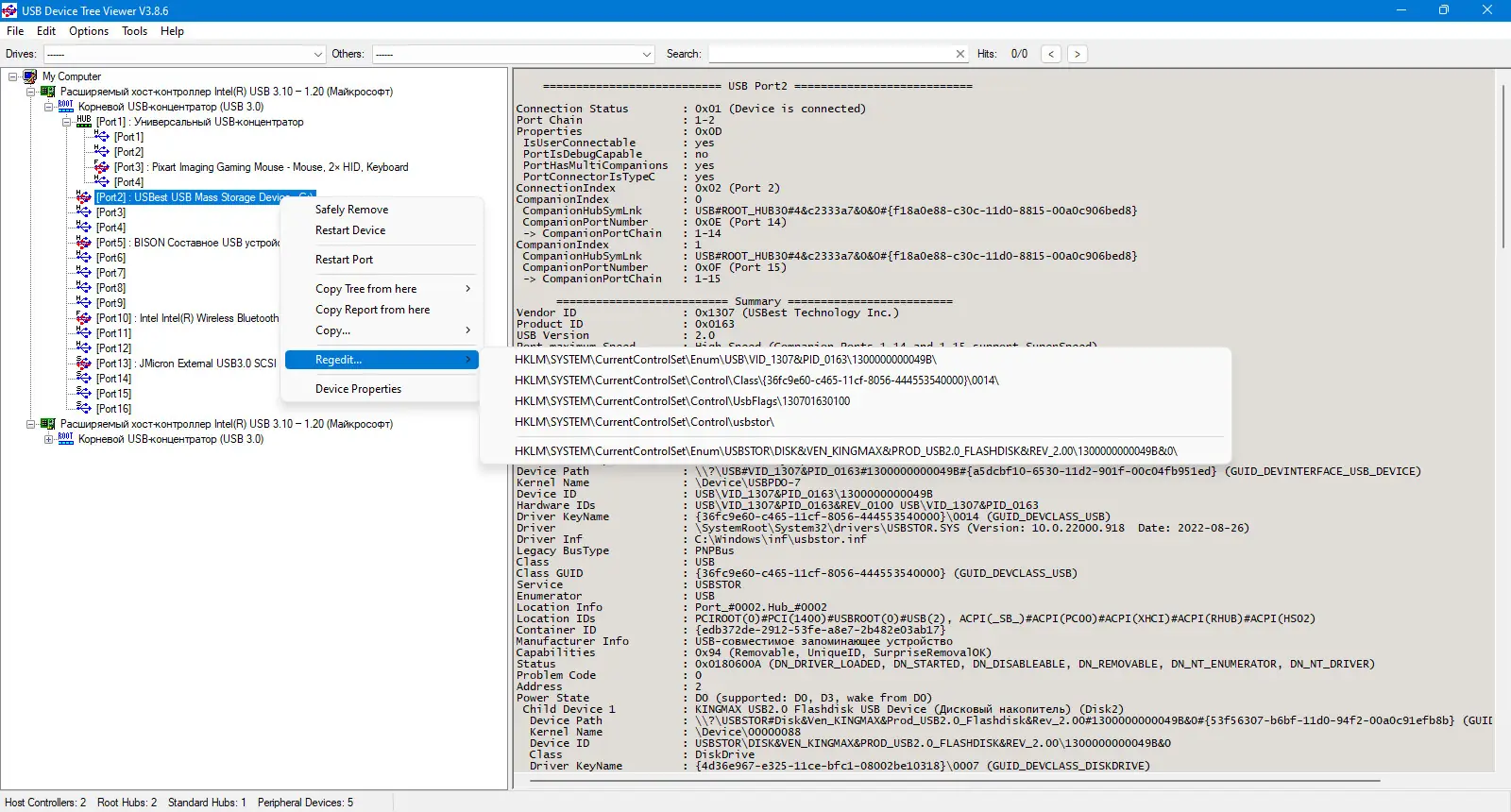 USB Device Tree Viewer — это компактная утилита для детального анализа подключённых USB-устройств, портов и хабов. Программа отображает всю иерархию в виде удобного древовидного списка, дополняя его расширенной информацией, включая буквы дисков, COM-порты и данные от диспетчера устройств. Интерфейс позволяет быстро находить нужные элементы, безопасно извлекать устройства и просматривать технические характеристики с возможностью копирования в буфер обмена. Инструмент особенно полезен для диагностики, администрирования и отладки USB-подключений в сложных системах.
