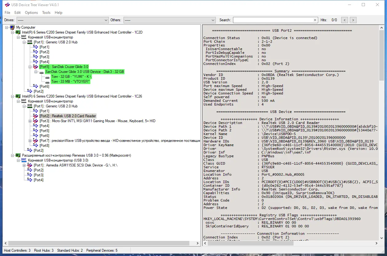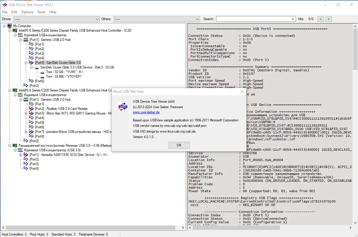- Расширенные возможности диагностики, включая отображение debug-портов хост-контроллеров и hex-дампов дескрипторов.