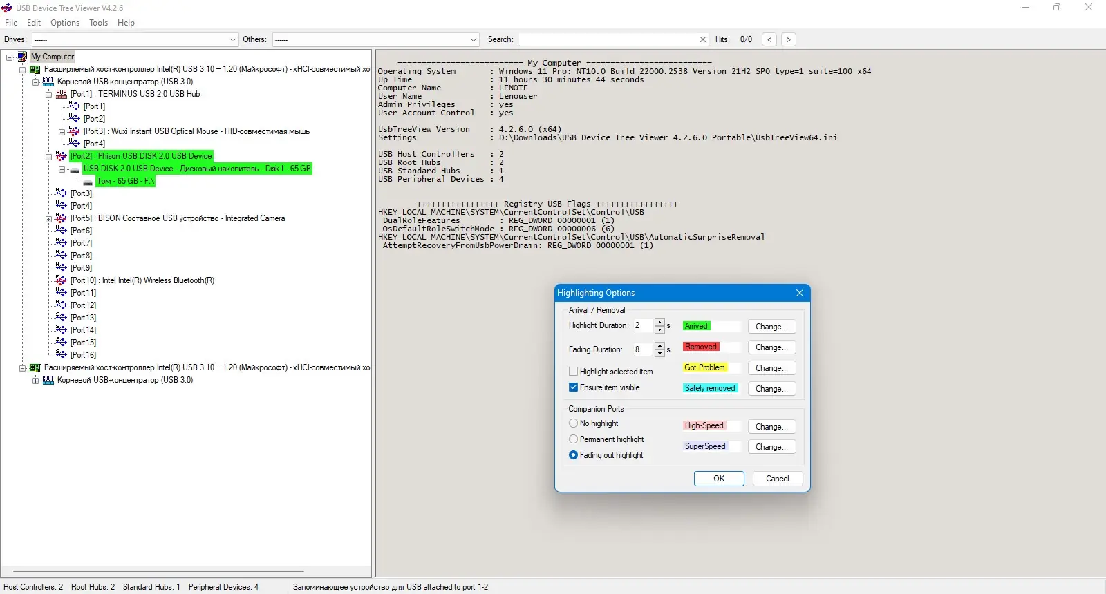 - Отображение всей USB-иерархии в виде древовидного списка с наглядной визуализацией подключений