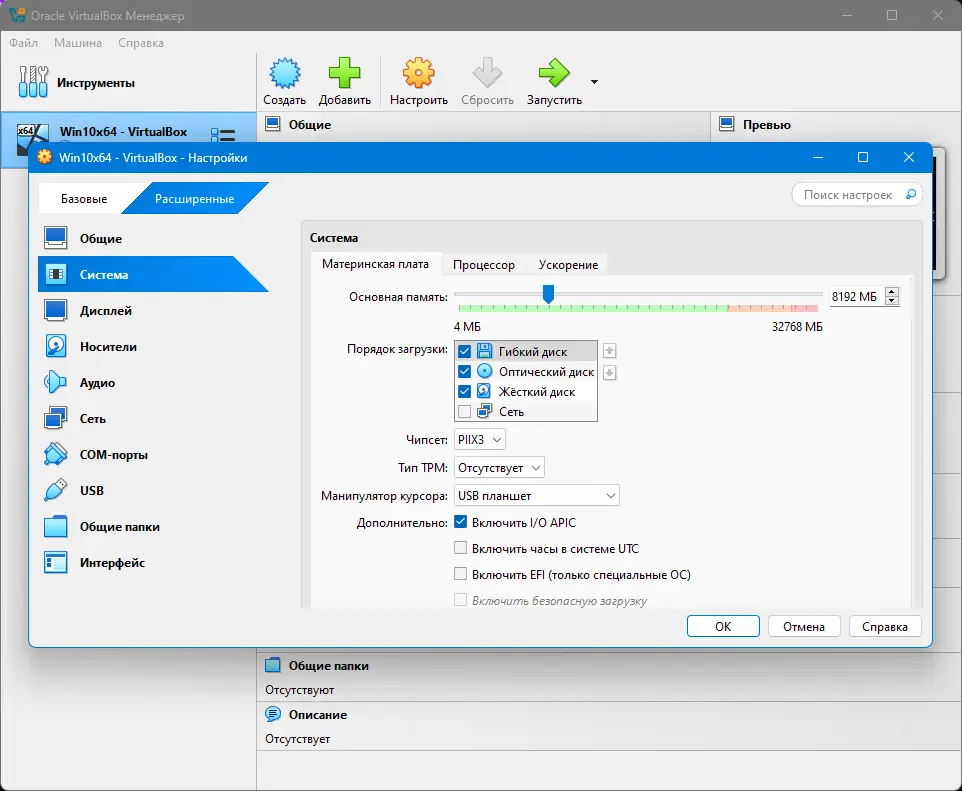 Для настройки удалённого доступа необходимо активировать поддержку VRDP, после чего подключиться к машине можно будет с любого устройства, поддерживающего RDP. Также можно подключать USB-устройства напрямую к виртуальной машине, что особенно полезно при работе с внешними накопителями или камерами. Управление настройками осуществляется через центральное меню, где можно редактировать параметры процессора, сети, звука и видеокарты.