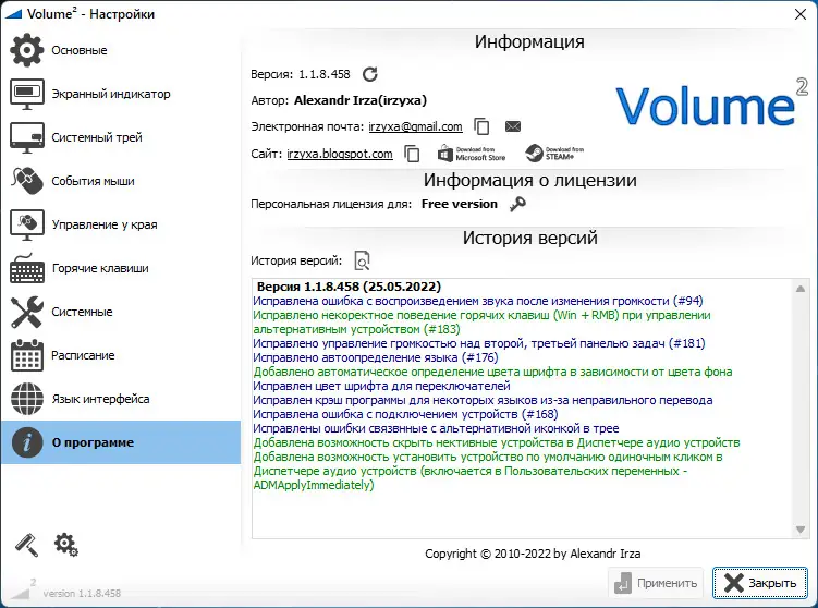 Volume2 — это продвинутый альтернативный регулятор громкости для Windows, заменяющий стандартный инструмент операционной системы и расширяющий возможности управления звуком через горячие клавиши, колесо мыши и другие пользовательские события. Программа поддерживает гибкую настройку интерфейса, работу с несколькими устройствами вывода и включает в себя визуальные улучшения вроде OSD и скинов для трея.
