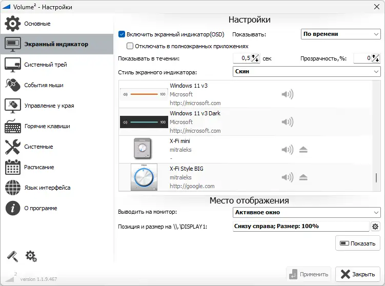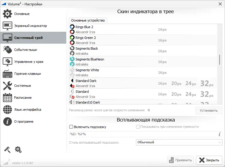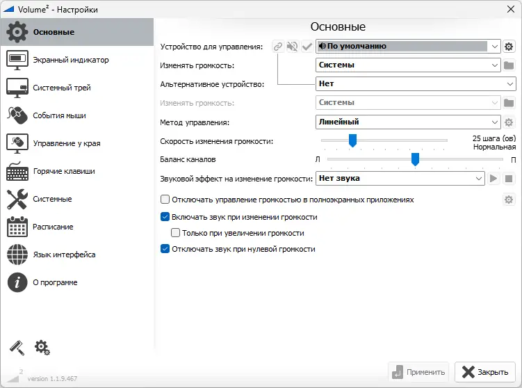 - Гибкое управление громкостью через мышь и горячие клавиши, включая возможность отключения звука одним кликом.