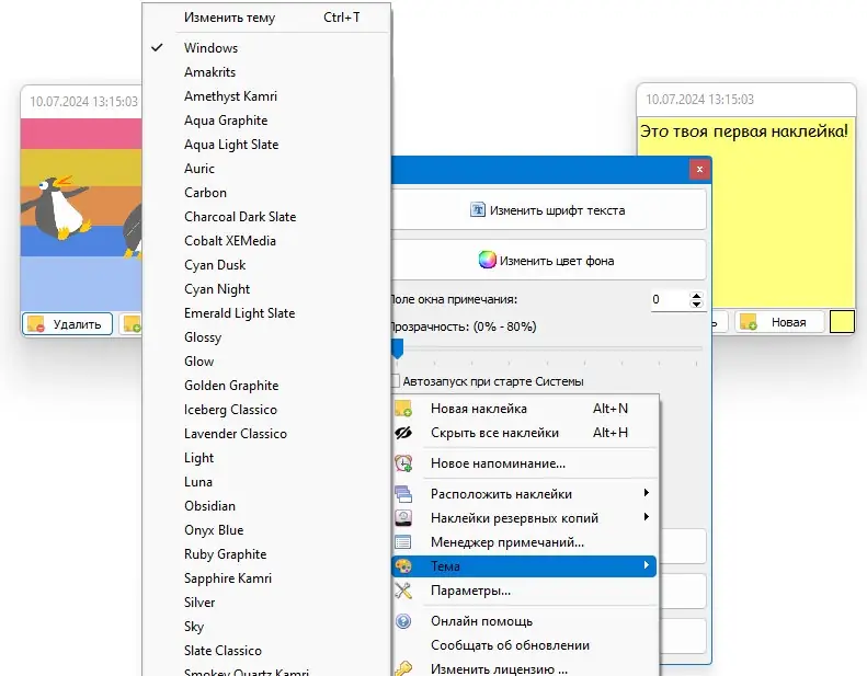 - Наличие тем даёт возможность выбрать подходящий стиль оформления — от классического жёлтого стикера до тёмного режима.