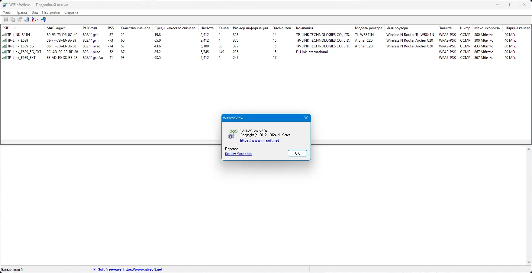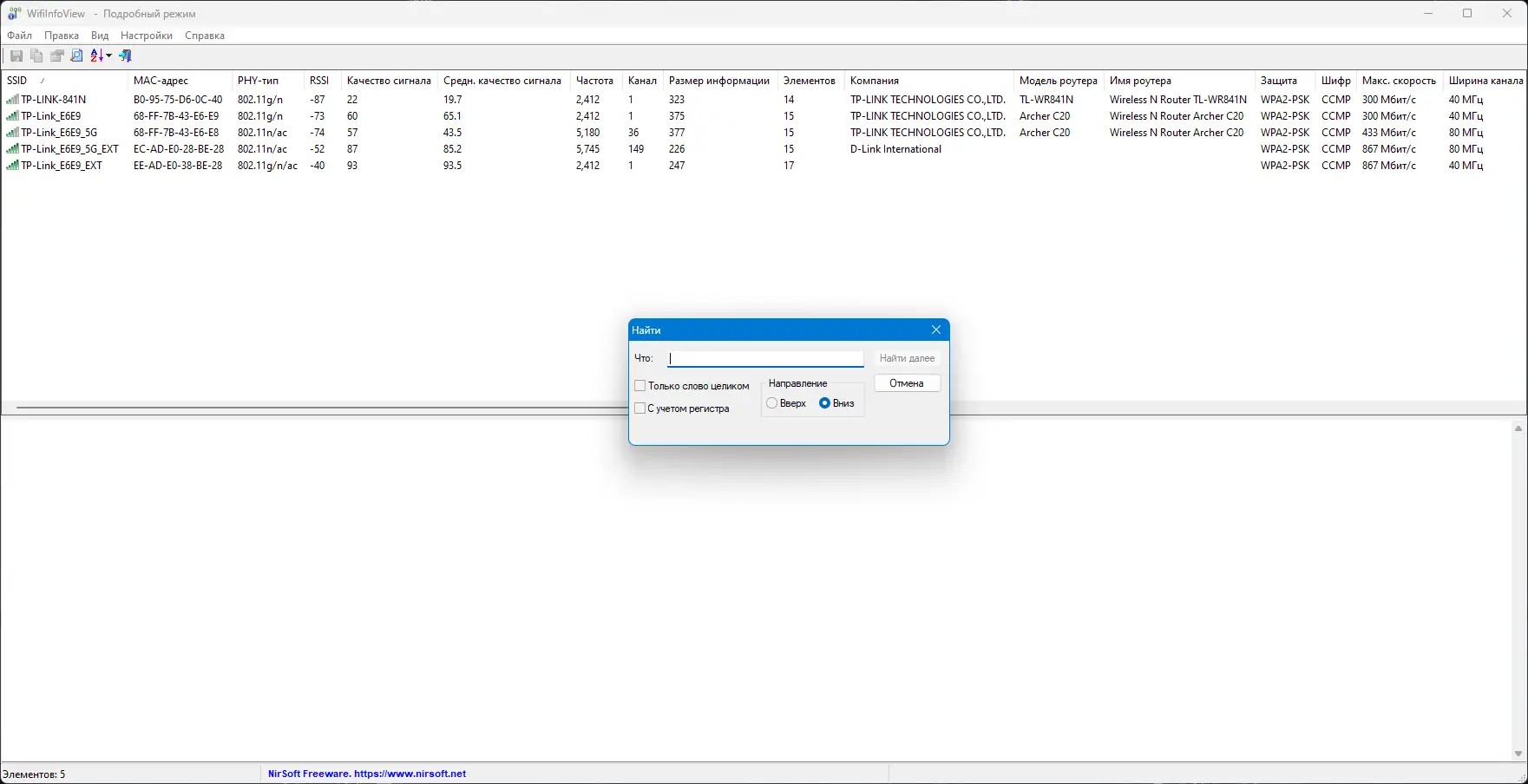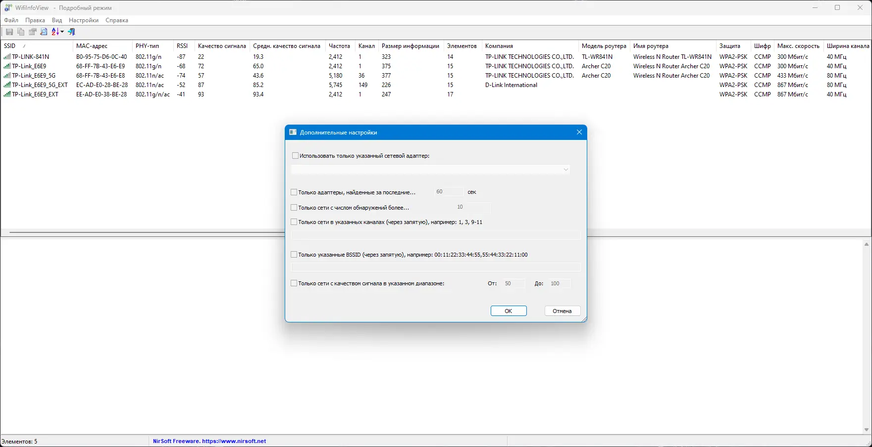 WifiInfoView — это компактное приложение, предназначенное для мониторинга и анализа эфира в зоне действия Wi-Fi адаптера. Утилита автоматически сканирует окрестные беспроводные сети и собирает данные о них, включая SSID, канал передачи, тип PHY, частоту диапазона, мощность сигнала и шифрование. Все сведения выводятся в виде удобной таблицы, где можно быстро оценить качество соединения и выявить пересекающиеся каналы, мешающие стабильной работе сети.