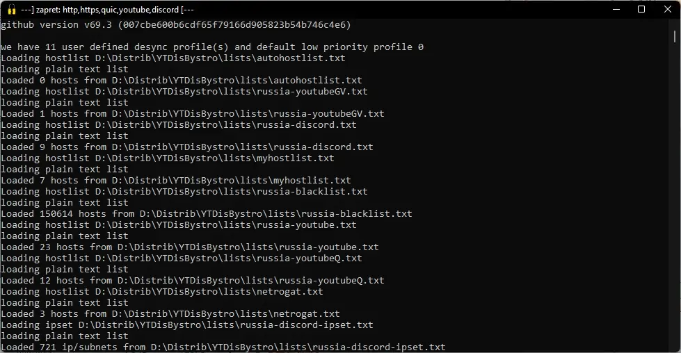 YTDisBystro — легковесная утилита на основе zapret, разработанная для стабильного обхода блокировок популярных интернет-ресурсов, таких как YouTube, Discord, Instagram, Facebook и X (бывший Twitter). Программа работает через командную строку, не требует установки лишних компонентов и отличается минимальным потреблением системных ресурсов. Поддерживает гибкую настройку, работу в фоне как служба Windows и автоматическое управление списками блокировок.