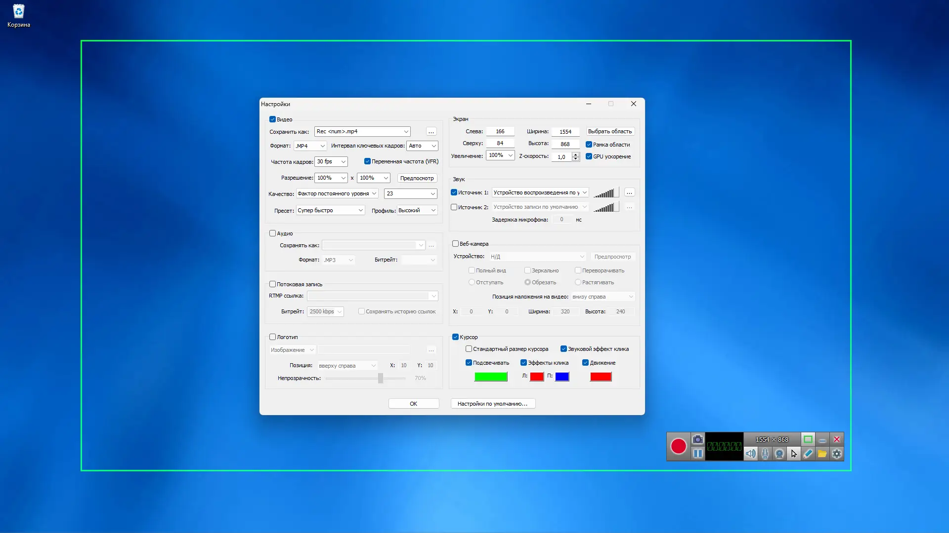 - Поддержка записи с нескольких мониторов и гибкая настройка области захвата