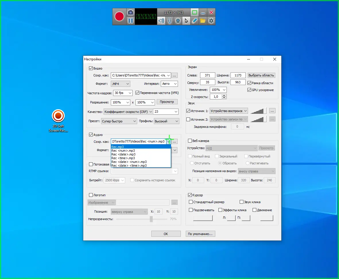- Поддержка записи в полноэкранном и оконном режимах, а также выделения произвольной области экрана.