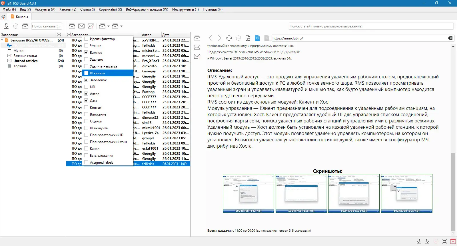 - Гибкая настройка интерфейса, включая смену тем и цветовую индикацию новых и непрочитанных статей.