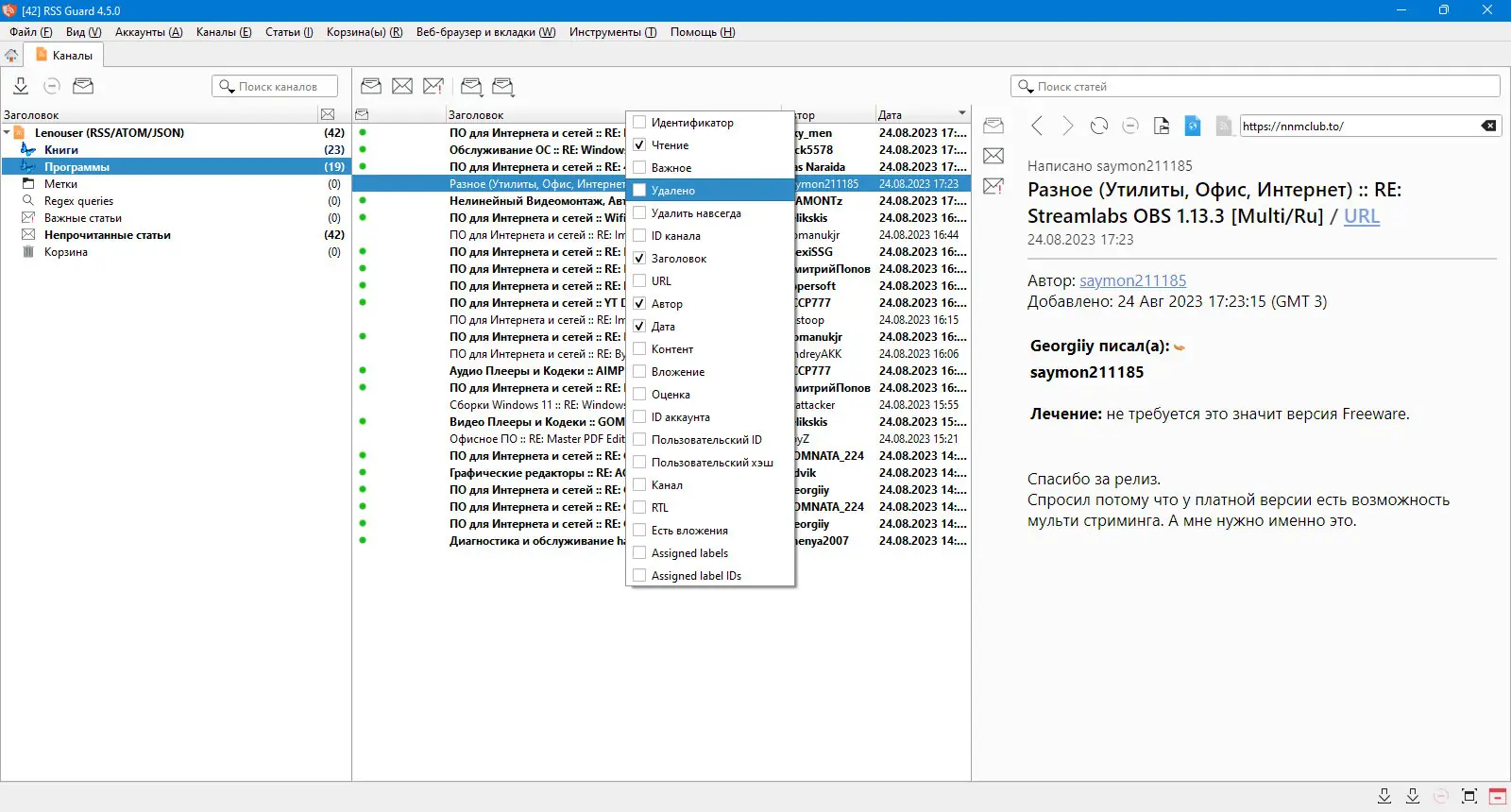 Работа с RSS Guard