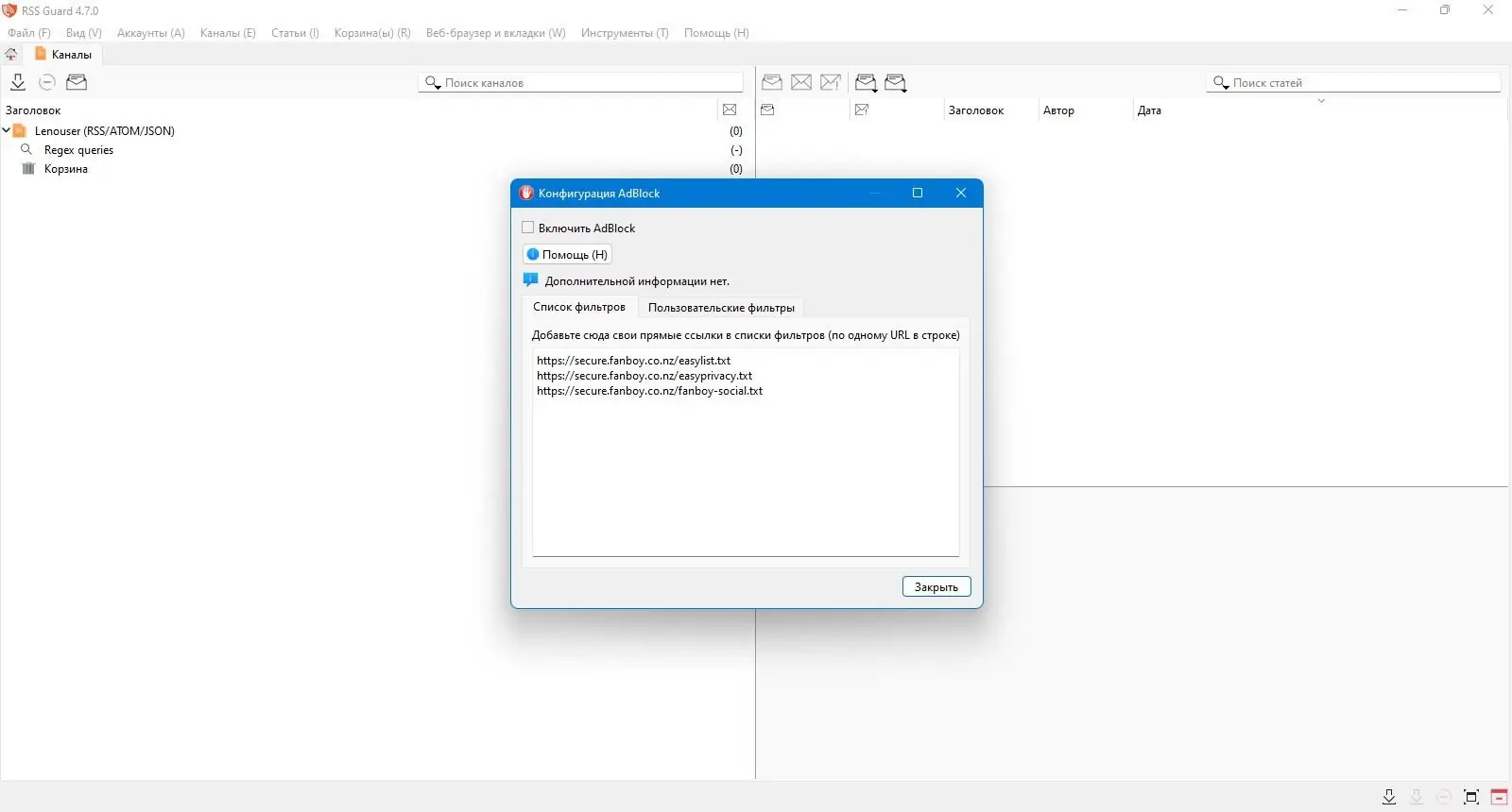 Пользоваться RSS Guard просто и интуитивно понятно. После запуска можно сразу приступить к добавлению каналов, указав URL нужной ленты. Каждый канал можно назначить в определённую категорию, что помогает поддерживать порядок даже при большом количестве подписок. Для удобства доступны настройки автоматического обновления, фильтрации новостей и управления уведомлениями. Встроенный веб-браузер на базе WebKit позволяет просматривать статьи без необходимости открывать внешний браузер, а вкладки сохраняются между сессиями. Поддержка прокси, отключение JavaScript и изображений повышают безопасность и скорость загрузки. Пользователь может настроить аутентификацию для закрытых лент, ставить закладки на важные новости и создавать резервные копии конфигурации.