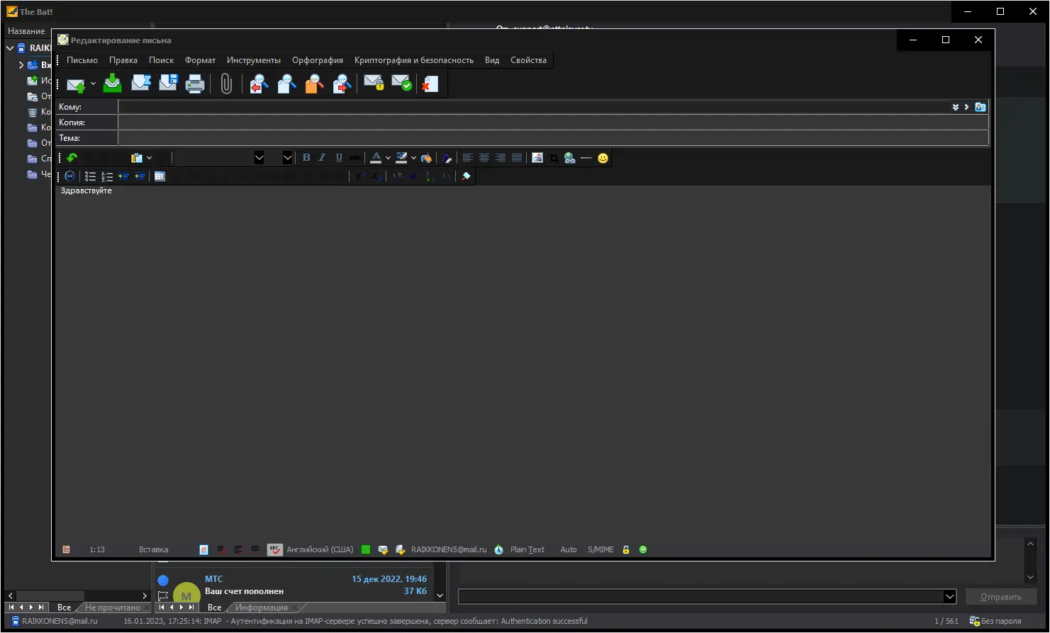 The Bat — мощный и защищённый почтовый клиент, предназначенный для эффективной работы с электронной почтой. Программа поддерживает продвинутые функции шифрования, фильтрации и автоматизации, обеспечивая надёжную защиту писем и конфиденциальности пользователя. Удобный интерфейс, совместимость с различными протоколами и глубокая настройка делают её идеальным решением для профессионалов и корпоративных пользователей.