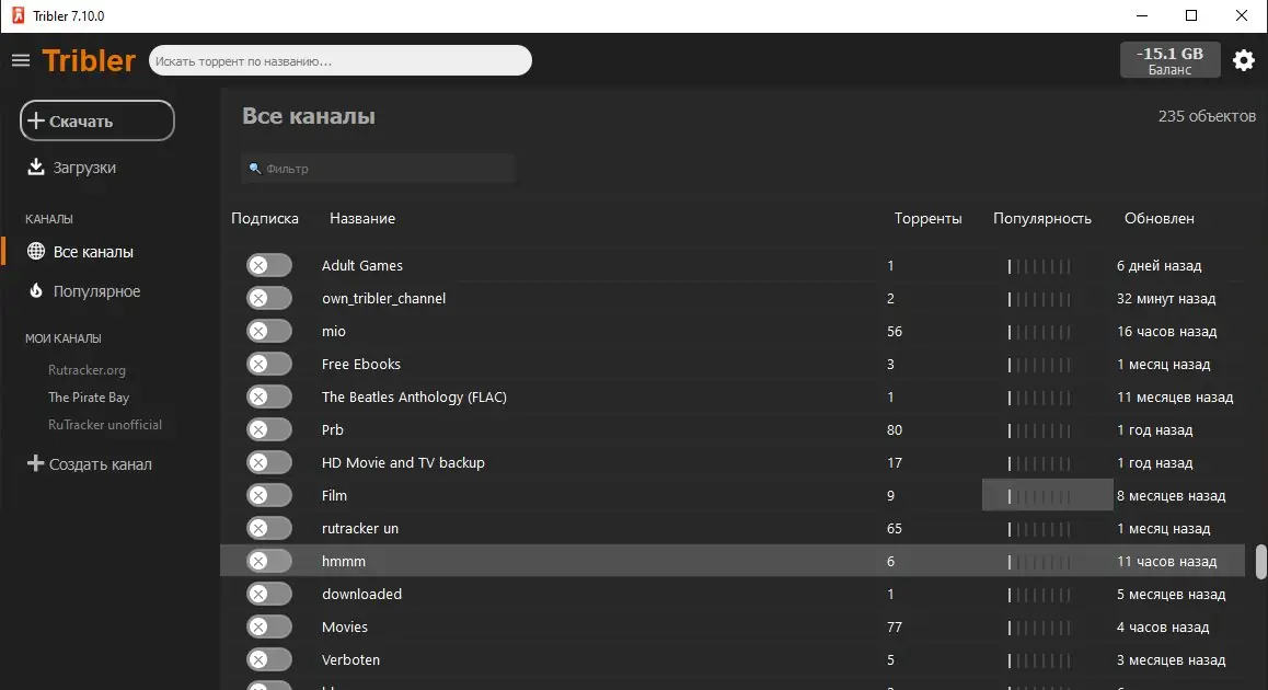 Использование Tribler не требует сложной настройки. После установки приложение автоматически подключается к одноранговой сети и начинает индексировать доступный контент. Поиск осуществляется через строку ввода по ключевым словам, без необходимости переходить на сторонние сайты. Найденные результаты можно просматривать, запускать в потоковом режиме или добавлять в загрузки. Пользователи могут создавать собственные каналы, делиться торрентами и управлять репутацией участников. Интерфейс интуитивен: основные элементы расположены в левой панели, а просмотр содержимого каналов реализован в виде навигации по вложенным уровням. При создании торрента система предлагает добавить метаданные и опубликовать его в персональном канале. Все операции происходят в фоне, без необходимости ручного управления трекерами или раздачи.