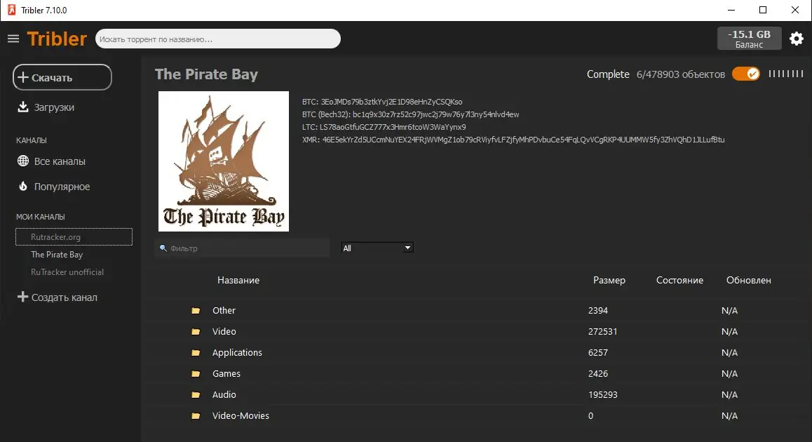 - Иногда возникает ситуация, когда Tribler не качает данные, особенно при низкой активности пиров в канале