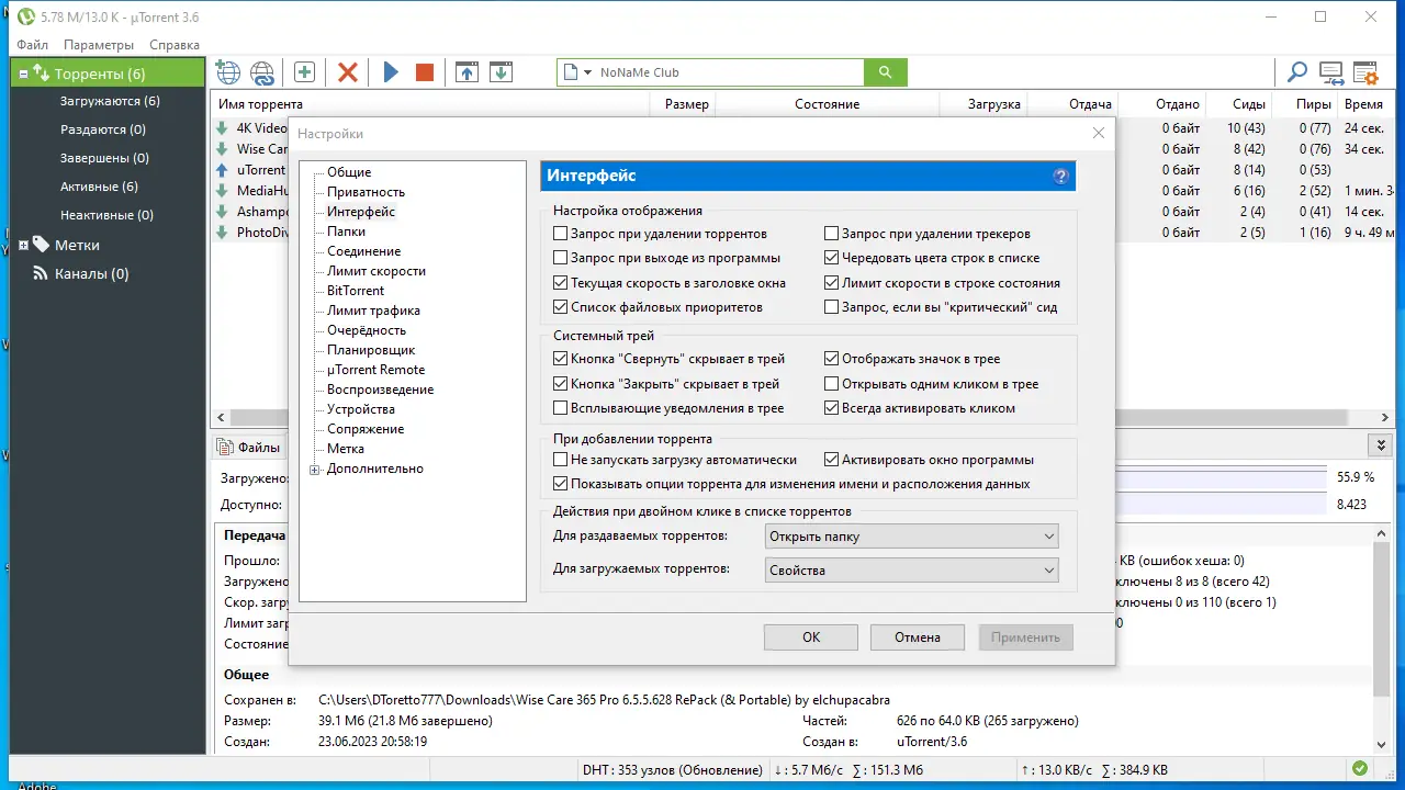 - Возможность настройки приоритетов и ограничения скорости раздачи и загрузки