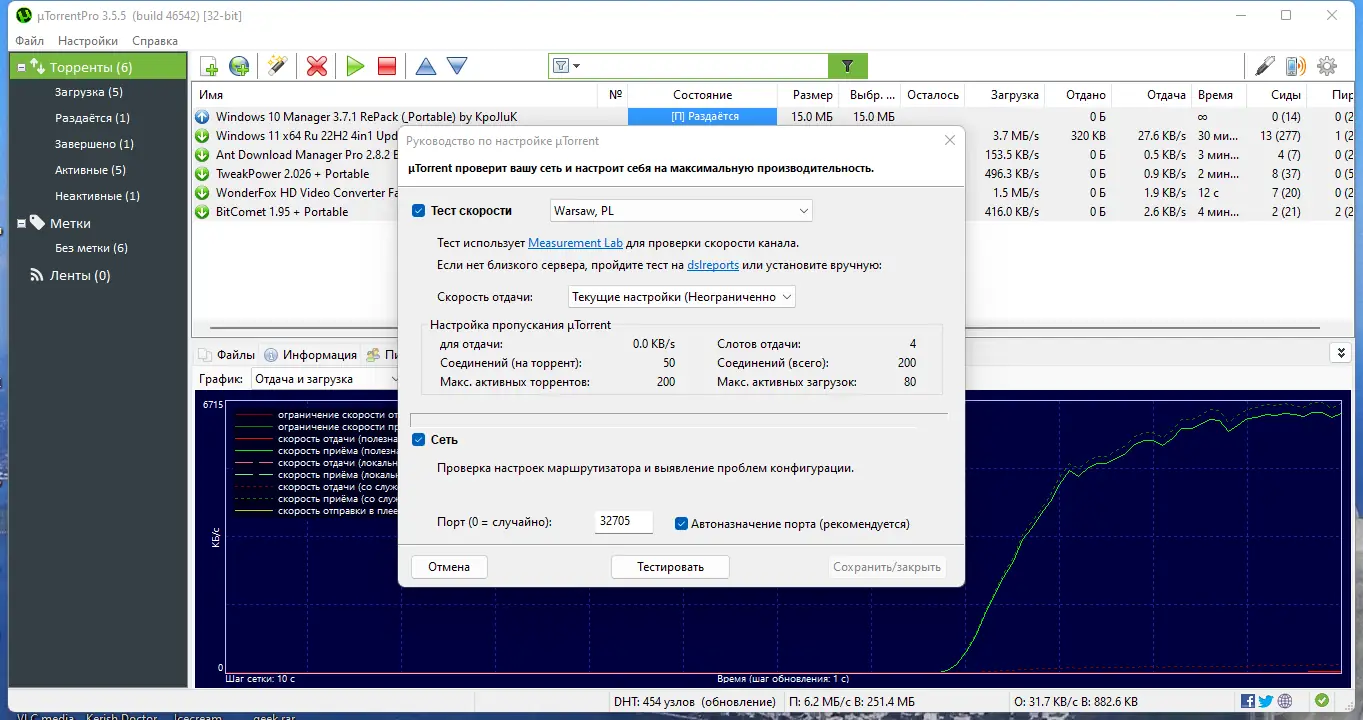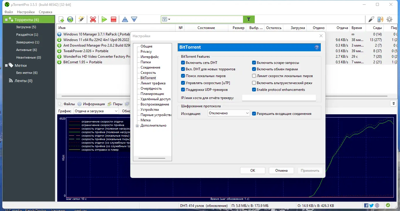 - Поддержка DHT позволяет подключаться к раздачам даже при отсутствии активного трекера.
