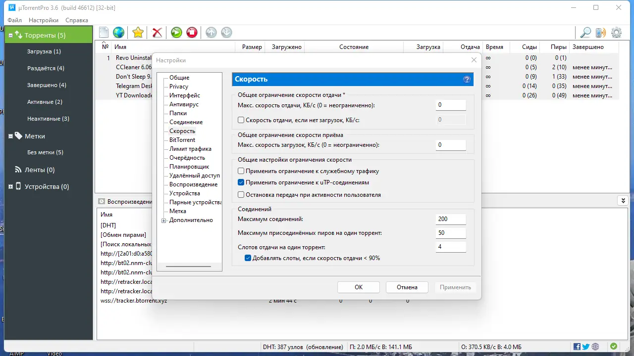 Программа совместима с DHT, что позволяет обмениваться данными даже при отсутствии активного трекера.