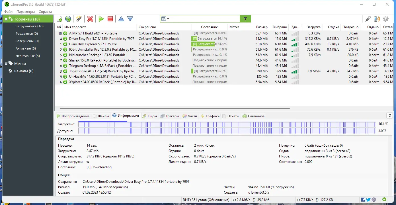 - Наличие портативной версии и возможность установки на Windows 10 и 11 делает uTorrent универсальным решением для разных сценариев использования.