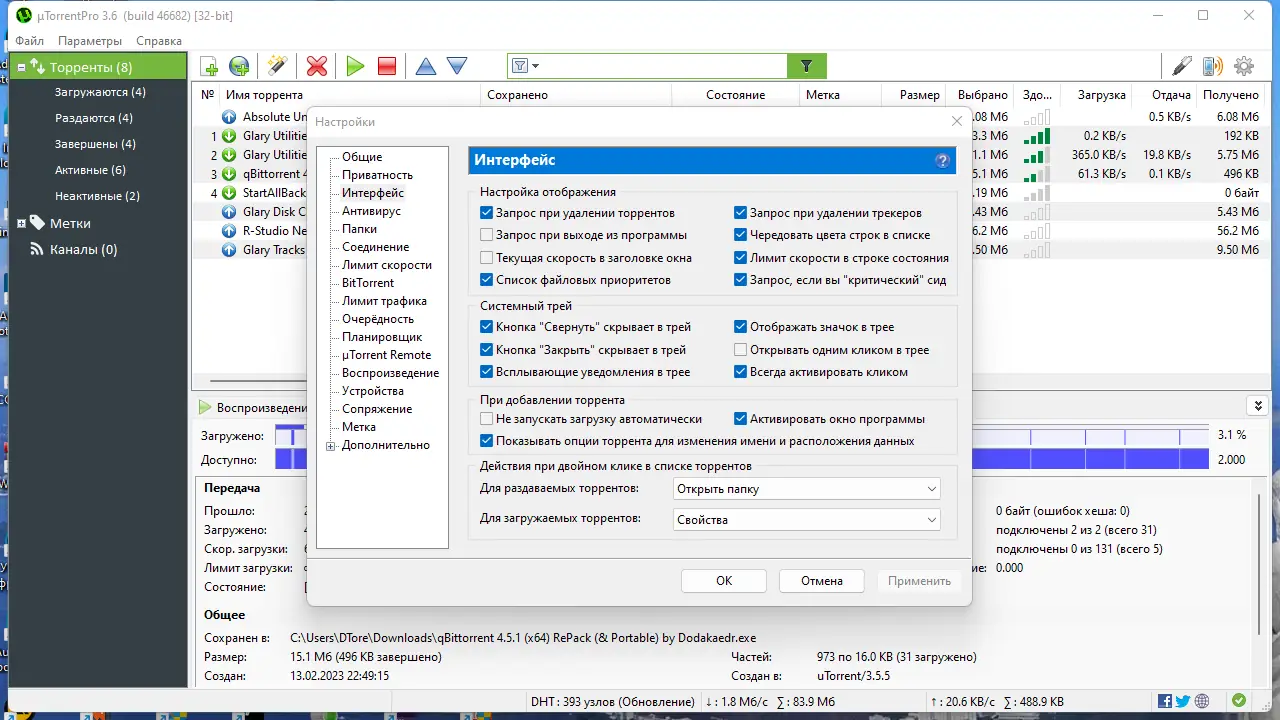 - Поддержка шифрования, DHT и автоматического проброса портов через UPnP.