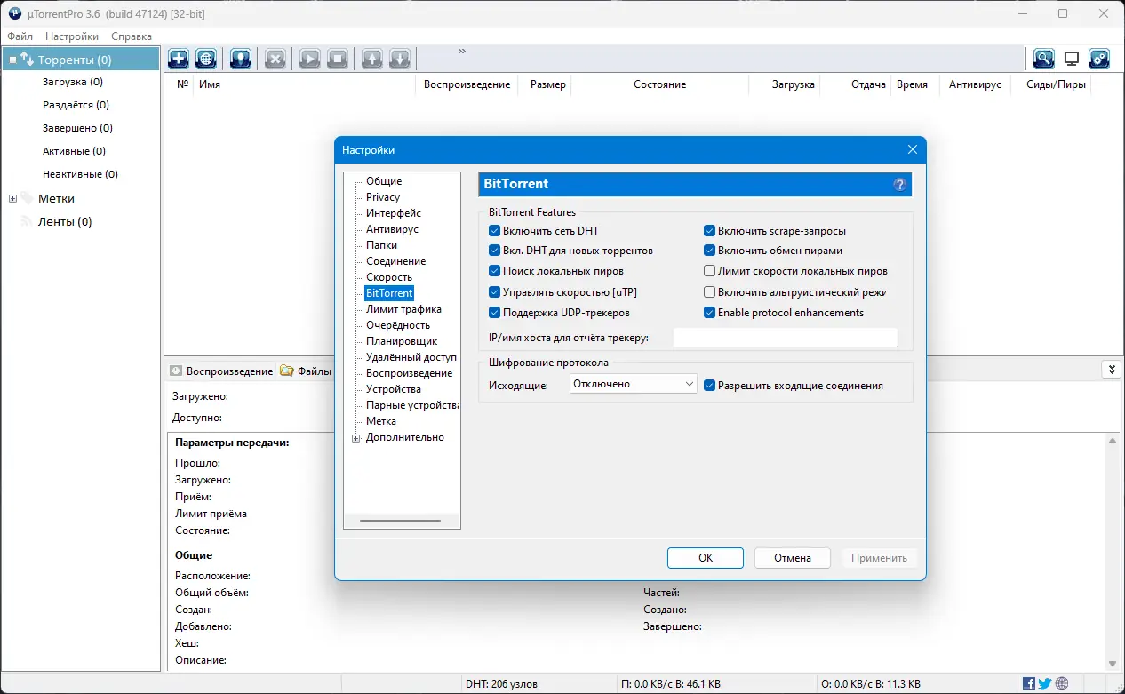 - Поддержка работы без трекера за счёт DHT расширяет возможности поиска пиров и повышает устойчивость соединения.