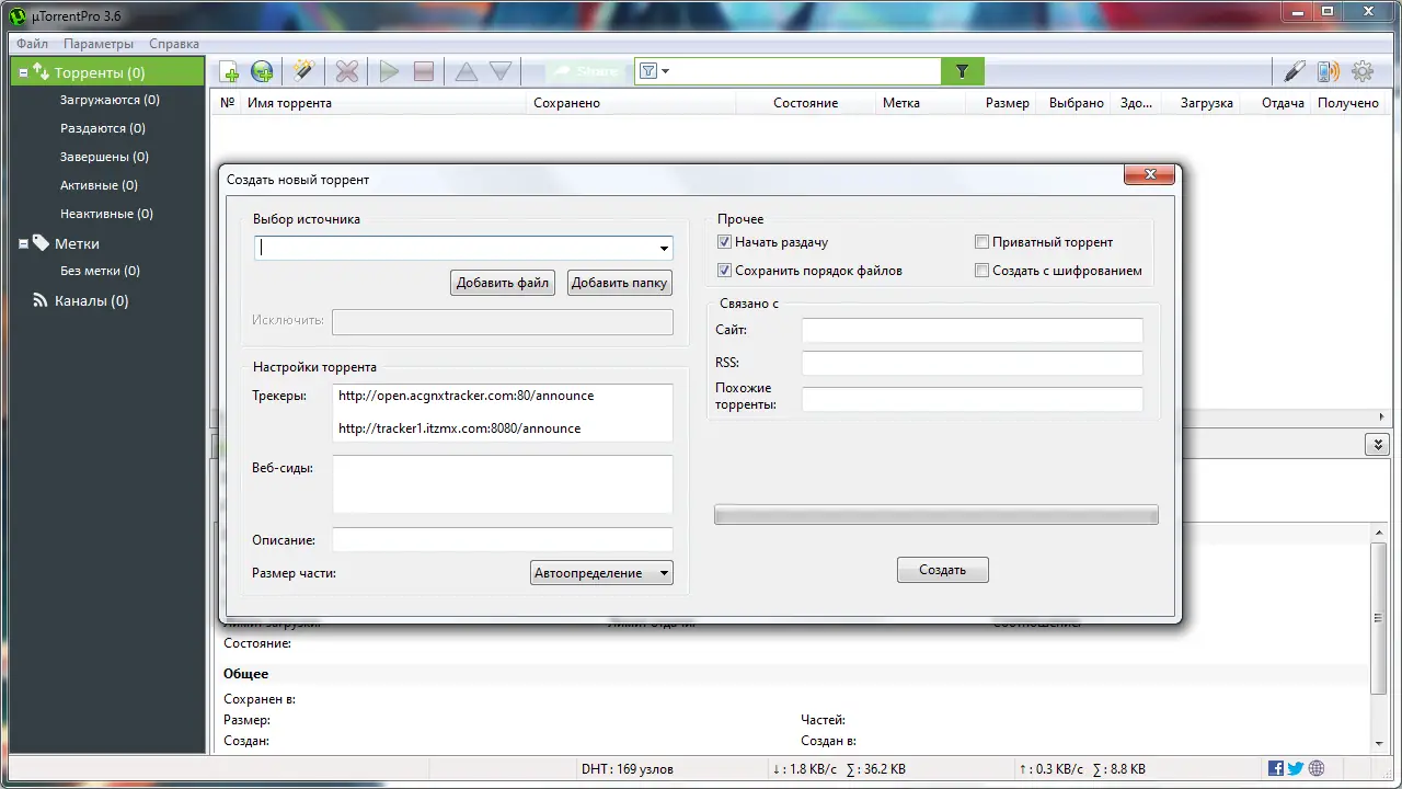 - Поддержка DHT и UPnP для упрощённого подключения к пирам без трекера.