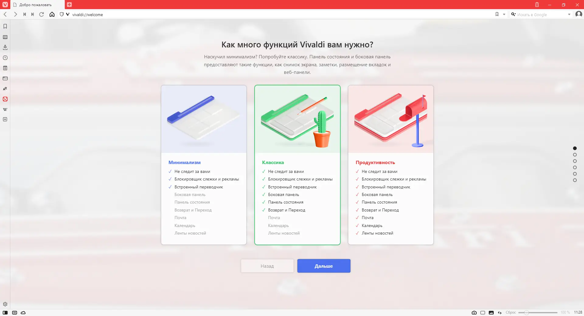 Интерфейс Vivaldi разработан с учётом принципов современного дизайна и эргономики, что делает его удобным даже при длительном использовании.