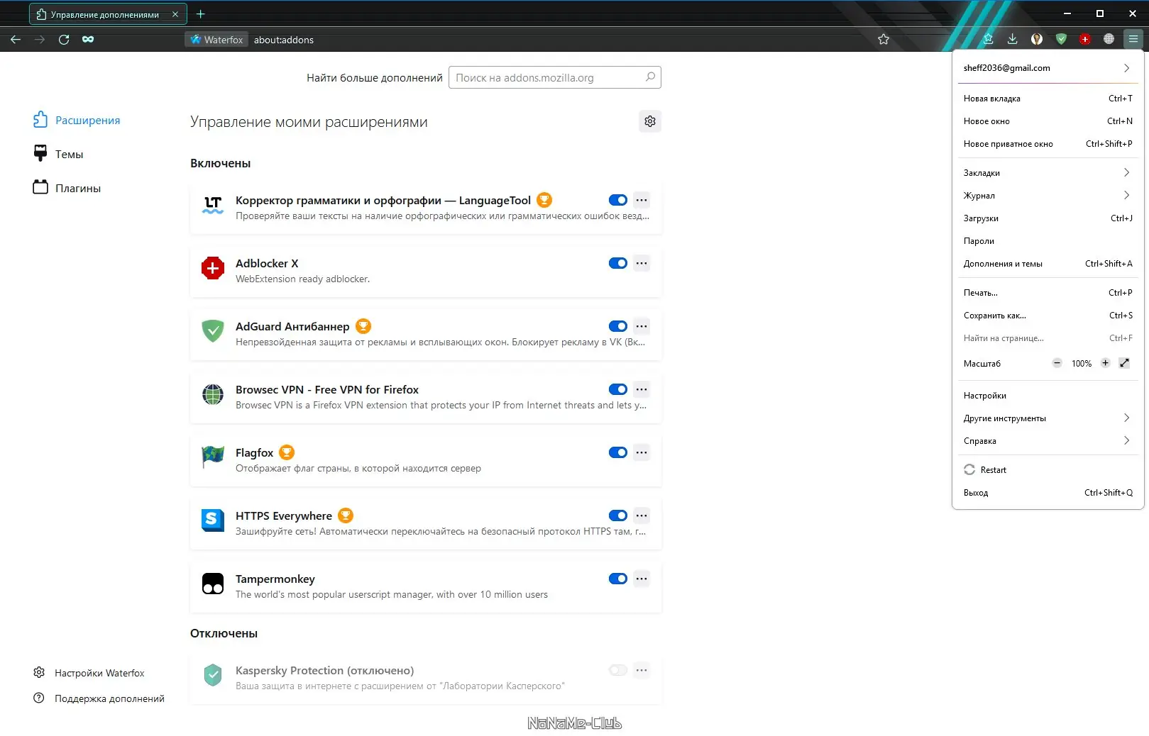 Работа с Waterfox